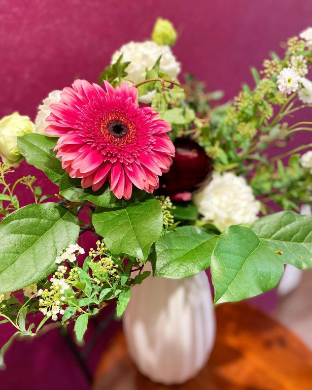 このガーベラが映える白いお花たちを選んでアレンジしてもらいました。