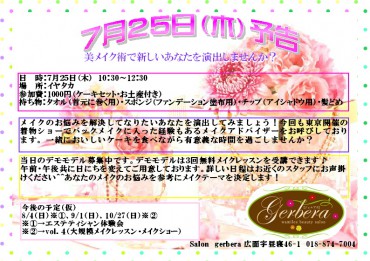 次回のメイクレッスン告知です平日開催は初です 日時:7月25日(木) 10:30~12:30 場所:パーティーギャラリーイヤタカ 参加費:¥1000(ケーキ・コーヒー・お土産付き) 今回のテーマは、夏をテーマにベースやポイントメイク…