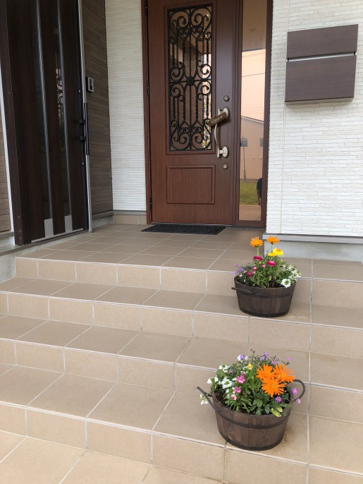 まだまだ、芝をひいたりとやることはあるんですが、お花が花壇に、玄関に来てくれただけでもとても華やかになりました![]()
