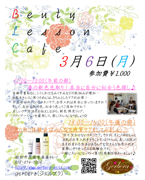 そしてお知らせ☆来月の3月6日(月)に御所野元町4丁目の公民館にてイベントを開催いたします(o^^o)♪午前に、新しく発売した「ブライトファンデーション」や、この春限定で発売するリップを使い、本当に自分に似合うファンデーションやリップの色は?というのを、実際に使用してみるイベントです☆