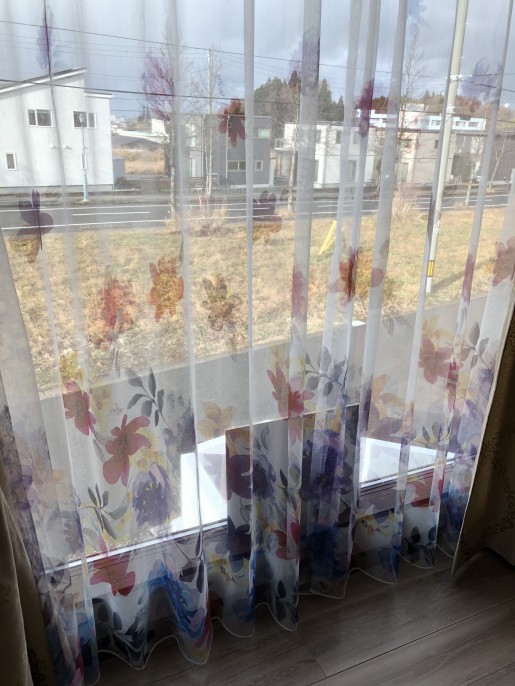 サロン二階の窓には、お花の可愛いカーテンが届きました