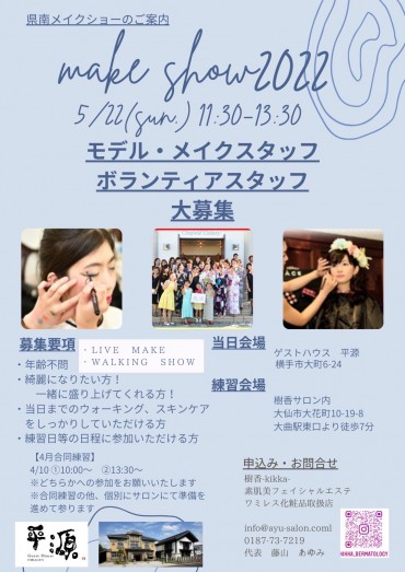 秋田県南 メイクショー開催決定 make show 2022 in 横手 date:2022.5.22(sun) time:11:30~13:30 place:guest House 平源 ticket:¥3,800 ※完全予約制 秋田市で開催し…